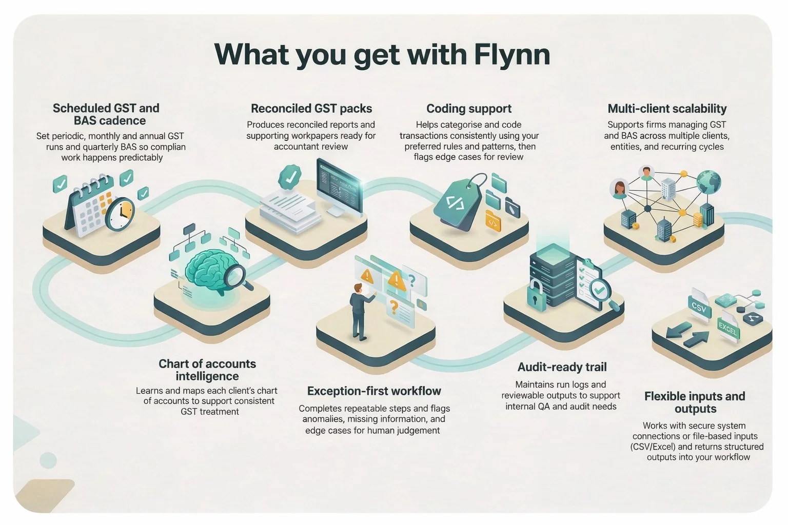 Flynn, trained by Accountants, does monthly, period & annual GST and quarterly BAS compliance and prepares reviewable, reconciled GST and BAS workpapers on a reliable schedule. Flynn learns each client’s chart of accounts and applies consistent rules to reduce manual handling, rework, and deadline pressure so your team can focus on exceptions, review and final approval.